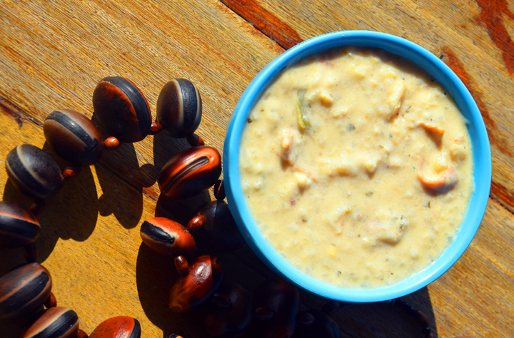She improvises with conch meat. Now, ideally the conch meat would be freshly harvested from the sea by my nephew who is part merman. But, the improvising continues when he is in college and not in Belize. We had to go to the market for our conch. Personally, I don't see how salmon chowder could possibly taste any better than this.