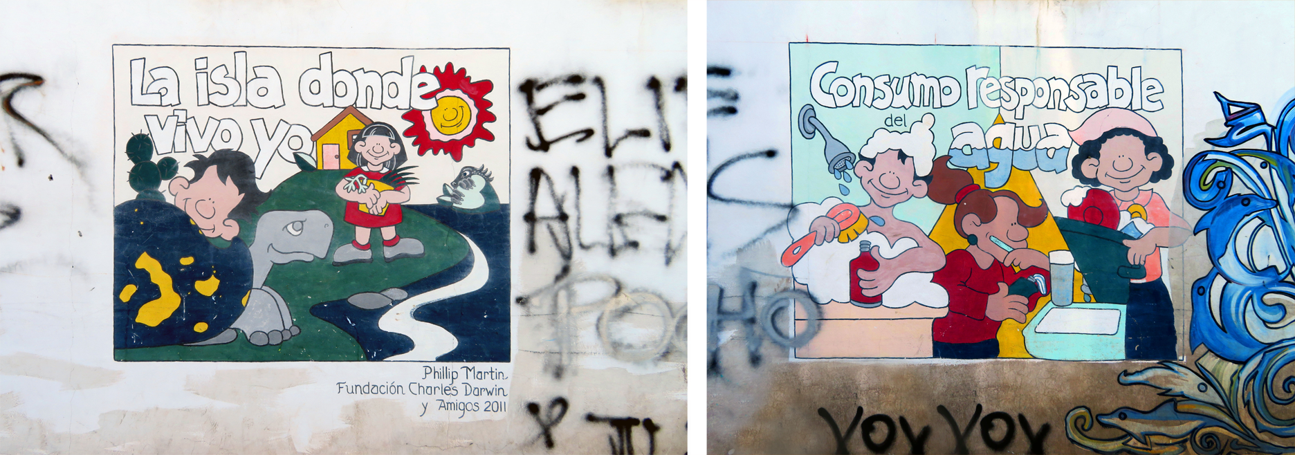 The Charles Darwin Foundation has an educational department. Plans were for me to work with them. They would help me paint murals on three different islands and I would create illustrations for educational materials they developed. Everyone was happy. For the first murals, on the island of Santa Cruz, they wanted murals that depicted living in harmony with nature, conserving water, and recycling.