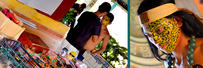 Inmar said he’d return with some photos to help me plan my mural. He showed up after 9:00 one night, well after the design was completed. Even though he was too late to make any difference, I wanted to see his pictures. And, I was completely blown away. He had photos of his Maya dance troupe, in full make-up and costumes, that were exactly the kind of thing I craved when I travel. Portraits! Portraits! Portraits! Was there any chance that they would perform while I was in town?