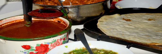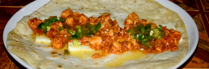 When everything is cooked, reach for the flour tortillas and put one on your plate. I was specifically instructed not to use corn tortillas. The tortilla size of choice for chilaquiles is the huge kind that covers an entire plate. (My favorite kind!) Now, you place the desired amount of chicken on your plate as well as the amount of jalepeño fire that works for you.