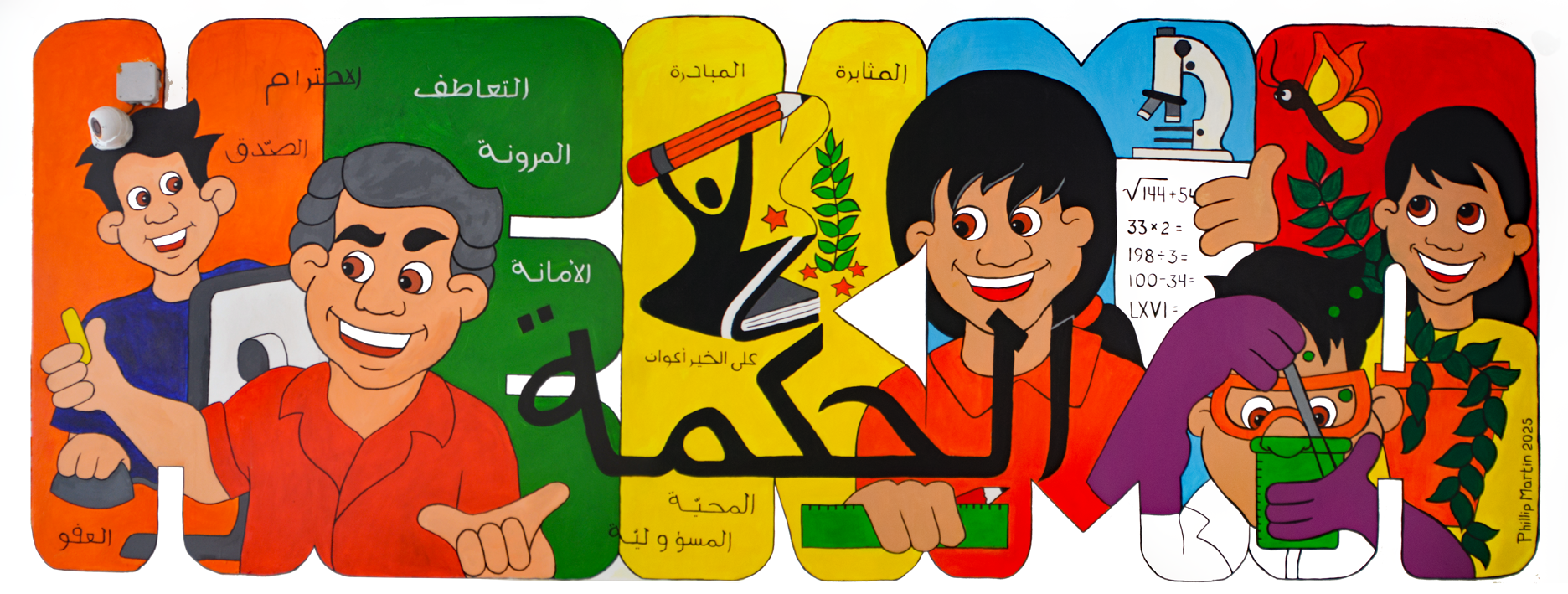 As usual, I brainstormed my design with administration and came with an idea that was readily and happily approved. In the very center of the design is an Arabic word that means "wisdom". Everyone was pleased with how well I wrote in Arabic. The writing is easy for an artist. The reading is impossible for me. But, everyone in the school could read what I wrote.