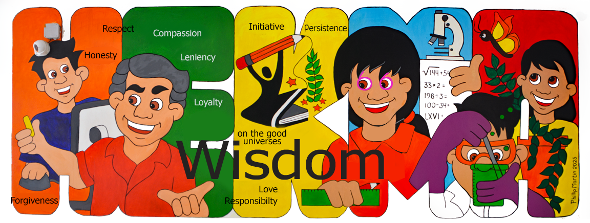 From left to right, the mural displays Computer Technology, a teacher surrounded by words that hopefully are taught and enacted by the students, part of the school logo, Mathematics, Chemistry, and Biology. Looking closer, the teacher holds a piece of chalk. I was informed when the mural was nearly completed that chalk is so outdated. I guess the muralist is too. The concepts that the teacher hopes to instill are initiative, love, loyalty, leniency, respect, honesty, compassion, responsibility, and persistence. There are several math problems on the paper that the student holds. If you do the math, each answer is 66 since this was mural 66 of my collection.