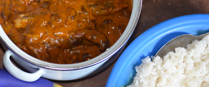 While the beans torborgee is boiling away, rice needs to be prepared. It’s very labor intensive in Liberia. First rice is placed in a woven platter called a rice fanner. The rice is tossed into the air and then caught in the fanner. The process is repeated a lot and the purpose is to blow away any chaff. Next, the rice in the fanner is examined to toss out any bad grains, dead insects, or stones that might be in the mix. Then, the rice is washed and rinsed several times to clean off an amazing amount of dirt you really wouldn’t want to eat. When it’s ready, each person is served a small mountain of rice. And, when the dish is prepared in your kitchen, I hope you appreciate your rice cooker.