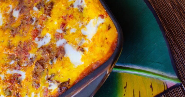 Pre-heat the oven to 350° F and then lightly spray your 9 x 13-inch casserole dish. Divide your plantain strips into three sections. Use one section to evenly cover the bottom of the casserole dish. Lay half of your cheese slices over the plantains. If you need to tear or cut some of the slices to cover everything, do what needs to be done. Then, spoon half of the meat mix over the cheese.