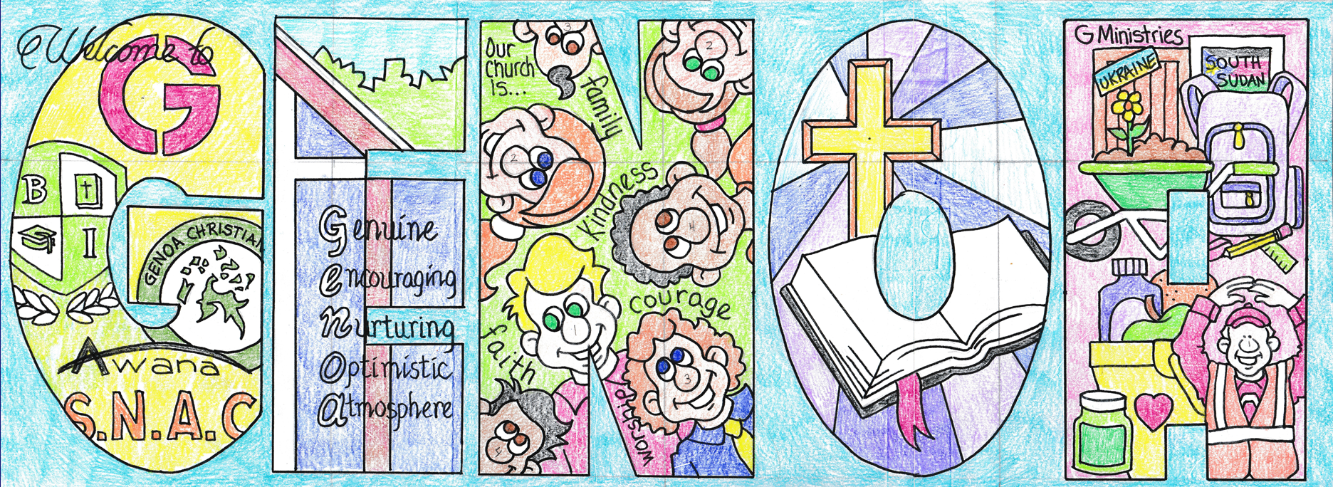 As usual, if I get my way, I like to illustrate a word. It doesn’t matter if most people never see the word. Each letter illustrates something to do with the overall theme. I figured that the natural word to select for this project was GENOA, the name of the church. In the letter G, I added logos for a selection of some of the different ministries offered. Everything Genoa has a very round “G” icon somewhere in the printing. I also included the orange logo for Celebrate Recovery, the emblem for the Genoa Bible Institute, the Lion mascot for the church’s academy, the logo for the Awana children’s ministry, and – of course – the S.N.A.C. icon. It was no small task to paint all of the letters and detail that the letter “G” possessed.