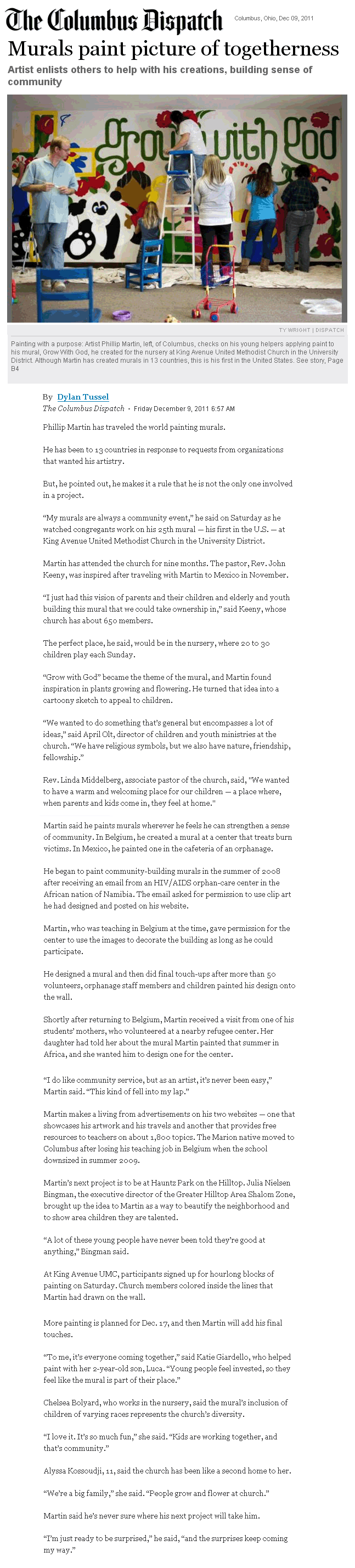 Again, it is wonderful to communicate in the only language I really speak. And, when the reporter from the Columbus Dispatch showed up at the mural site, he spent an entire hour gathering information. He not only interviewed me, but he talked to several people. I had no idea how he could weave the information all together, but I think he did a very good job on the article.