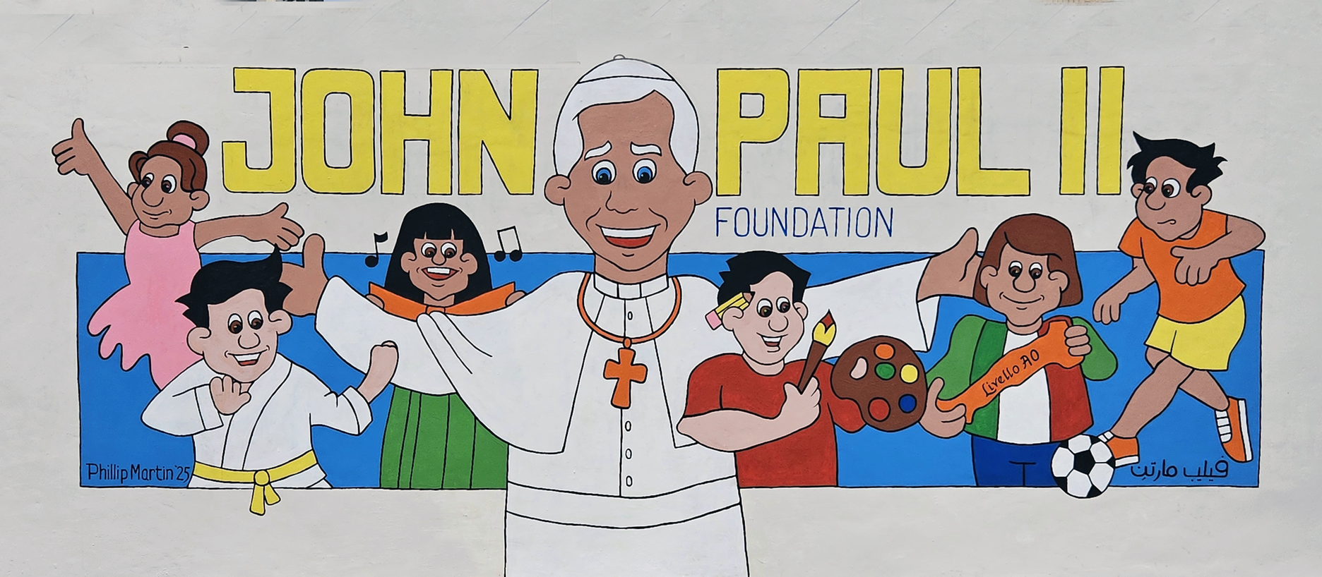 For the design of the large mural, I was shown an image of John Paul II surrounded by a lot of children involved in various activities. I was asked to do something similar in my style. No problem. I drew the Pope surrounded by children doing the six activities that I already said were done at the House of Peace.