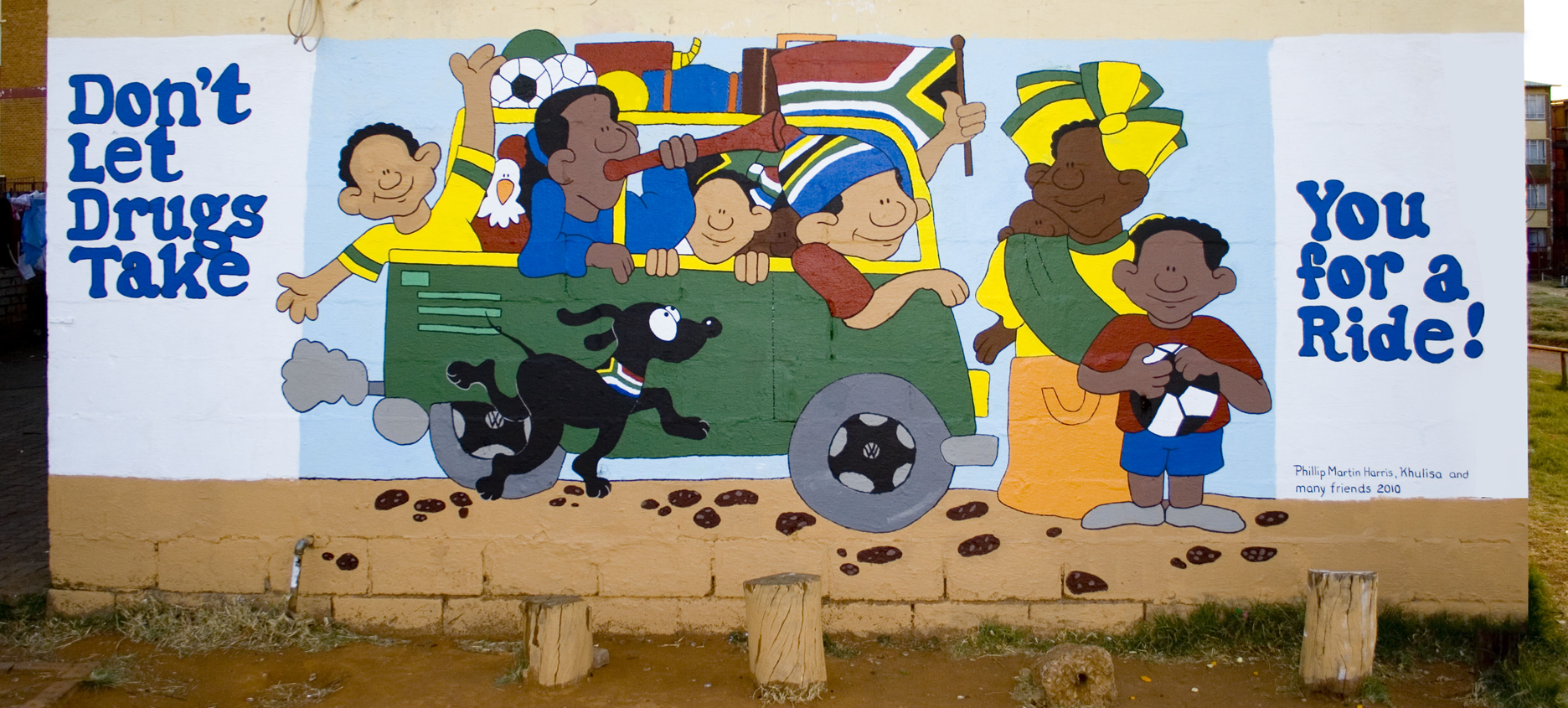 hosts.Khulisa is an organization that works with young criminal offenders, drug awareness, and a host of other problems faced by people growing up in the townships. So, it comes as no surprise that this mural was unlike any other I'd worked with. It was an anti-drug mural painted on the side of a housing flat at a street corner in a township where drug addicts hung out. The drawing showed a South African taxi bus with the message, "Don't let drugs take you for a ride!" There was every possibility that some of the painters were drug addicts. Certainly some of the spectators were. Even though it was close to freezing, (Well, at least it felt that way without gloves.) I had a crowd of painters and spectators every day. No, it wasn't hard to find volunteers to paint.