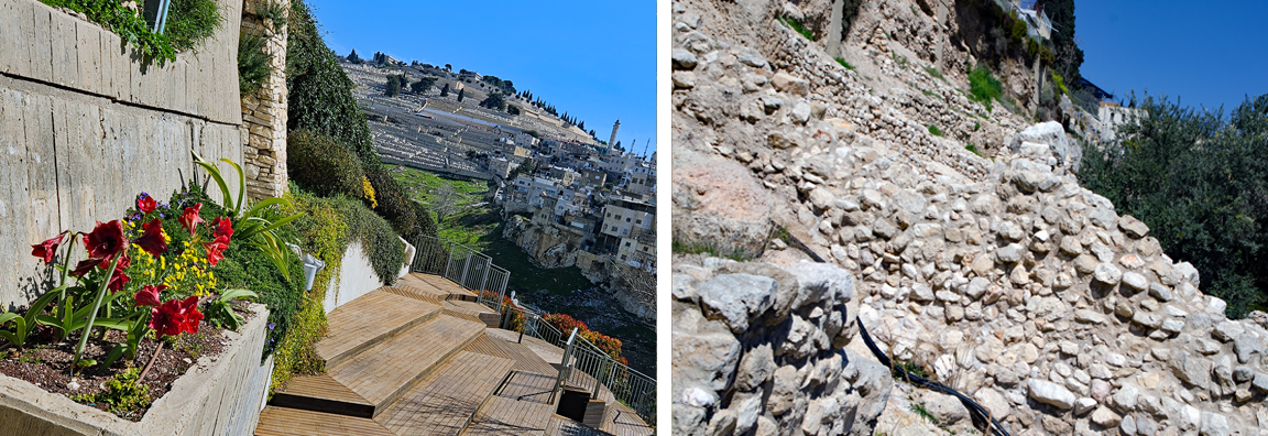 A view of the Mount of Olives beyond the flowers and excavation around David's palace