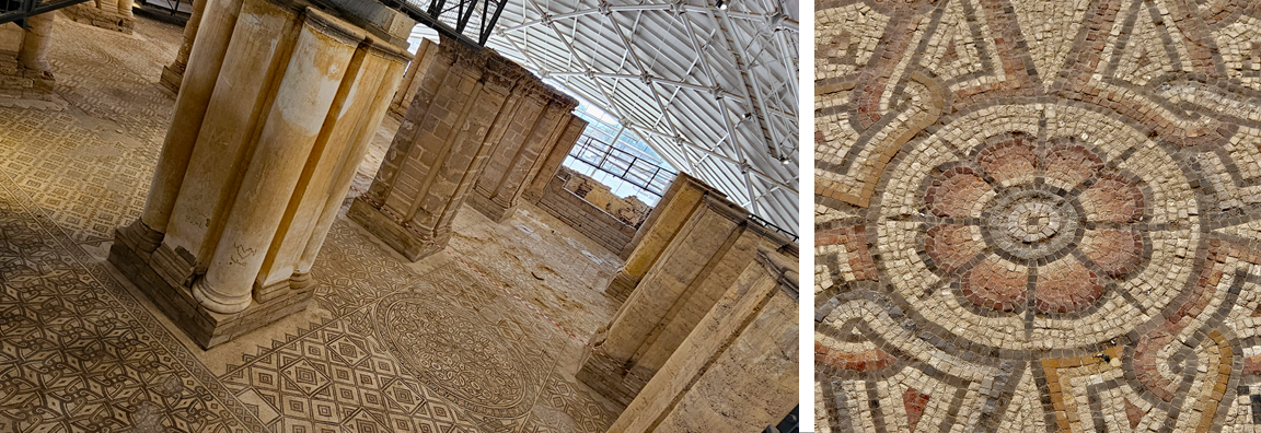 The floor of the 9,000 square foot (30 meters by 30 meters) bathing hall is covered in mosaic patterns. With more than five million stones (primarily in red, green, blue, yellow, and orange), it is one of the largest floor mosaics in the world. The floor is divided into 38 mosaic carpets, separated by 16 cluster columns in rows of four. The bathing hall was a pretty amazing until I saw the communal latrine. Yep, back in the day, as you sat to do your business, there was no need for privacy. You and your friends could sit in a row and discuss other business, politics, the weather, constipation, diarrhea, or anything else that came to mind.
